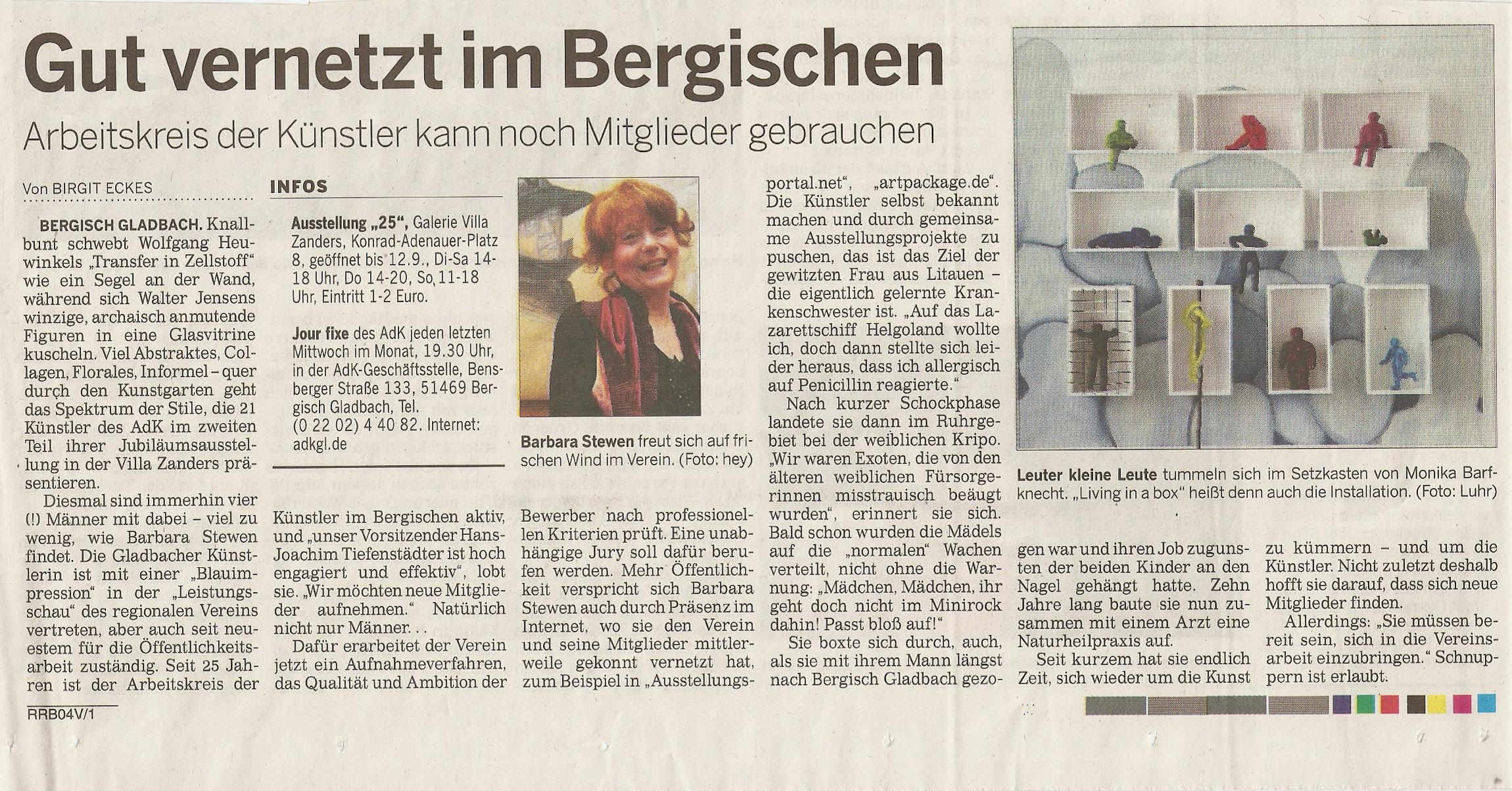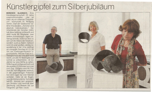 "Fünfundzwanzig - 25 Jahre AdK"Jubiläumsausstellung des Arbeitskreises der Künstler Bergisch Gladbach e.V.vom 15.08. - 12.09.2010in der Villa Zanders in Bergisch GladbachAusstellungsankündigung Bergische Landeszeitung vom 10. Juli 2010 Ausstellungsankündigung Kölner Stadtanzeiger vom 10. Juli 2010 Ausstellungsbericht Vernissage 2 Kölner Stadtanzeiger vom 18. August 2010 |