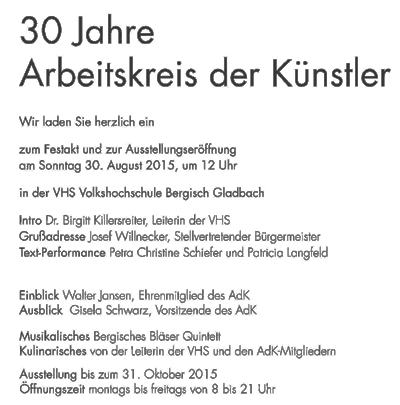 Inhalt der Ausstellung ist aber auch ein Rückblick auf die Tätigkeit des AdK von den Anfängen als kleine, nicht organisierte, Künstlergruppe 1984 über die Gründung eines Vereines im Jahr 1985 unter dem Namen „Arbeitskreis der Künstler Bergisch Gladbach e.V.“ Als Arbeitskreis hat der Verein sich zur Aufgabe gemacht, die Kunst in der Stadt und der Region zu fördern. Dies geschah in der Vergangenheit durch zahlreiche große und kleine Ausstellungen und Aktivitäten, die den AdK zu einem festen Bestandteil des kulturellen Lebens in Bergisch Gladbach machten.