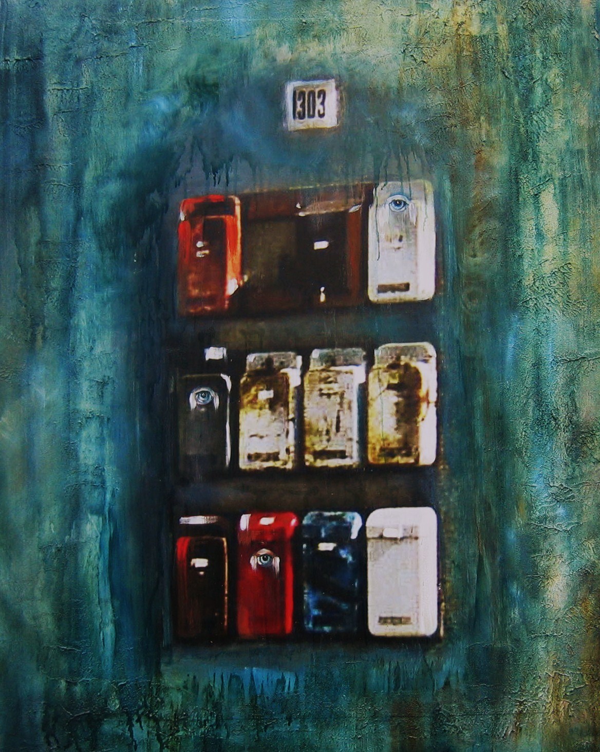 2009, Fotocollage, Öl, Sand auf Holz, 80 x 100 cm