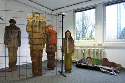 ZaungästeDie Zaungäste wurden gezeigt in der Ausstellung "Schattenseiten" in der Galerie A24. Presse: KSta und Bergische Landeszeitung vom 09.03.2017 "Die Schattenseiten beleuchtet" Danach fanden sie für mehrere Wochen Kirchenasyl im Foyer der Evangelischen Gemeinde Bensberg. © Barbara Stewen VG Bild-Kunst, Köln 2024