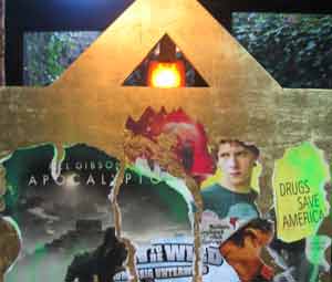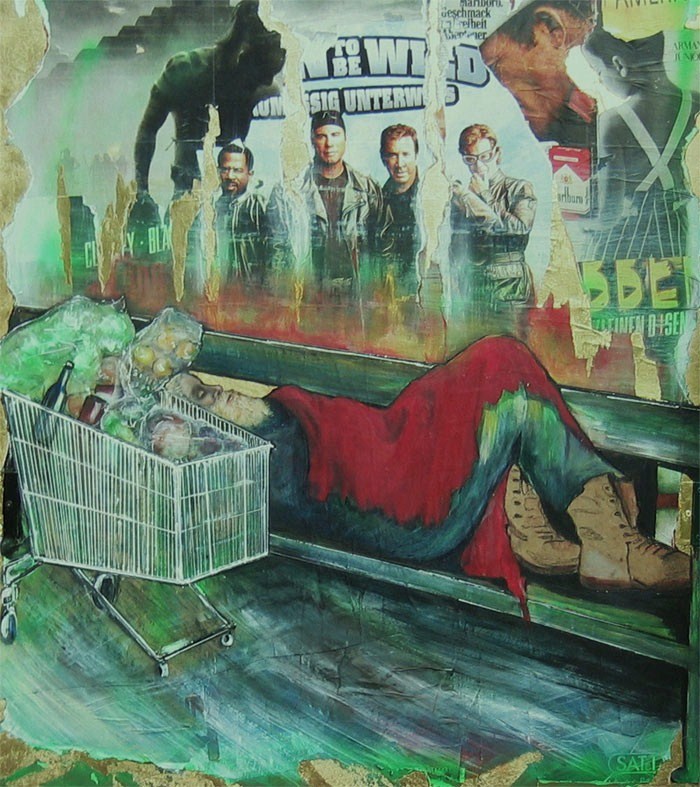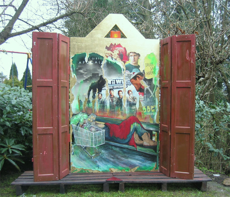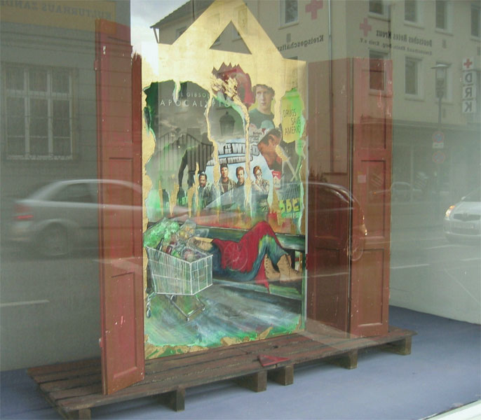 „My home is my castle, keep out“Tischlerplatte, Plakatfetzen, Sperrmüll-Fensterläden, alte Holzpaletten, Warnleuchte, Mischtechnik mit Blattgold, 2007, 177 * 94 cm (ohne Türelemente), © Barbara Stewen VG Bild-Kunst, Köln 2024 Keep out Charly im Winter Charly in der Stadt im FENEX-Fenster |