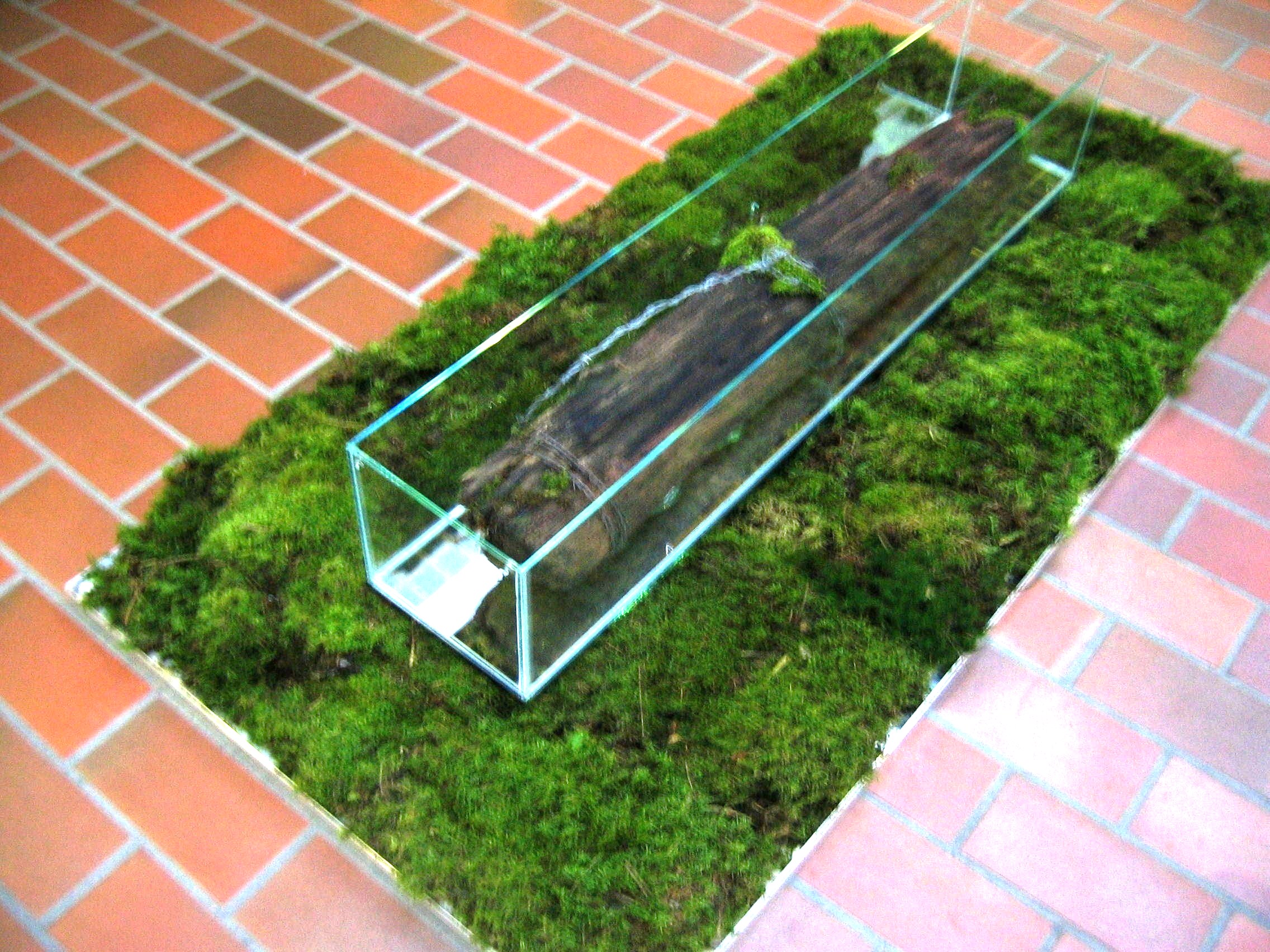 Glasschrein2011, Weidenzaun mit Stacheldraht im Glasschrein mit Spiegel auf Moosbett. Objektgröße: B 22 * L 120 * H 20, © Barbara Stewen VG Bild-Kunst, Köln 2024 Ich fand einen verrotteten, mit Stacheldraht umwickelten Weidenzaun am Wegesrand. Nachdem ich einige Tage vorbeigeeilt bin, nahm ich ihn mit und legte ihn zur "Bewahrung" in einen Glasschrein. Was über dem Schrein ist, spiegelt sich im Innern des Schreins wider.
